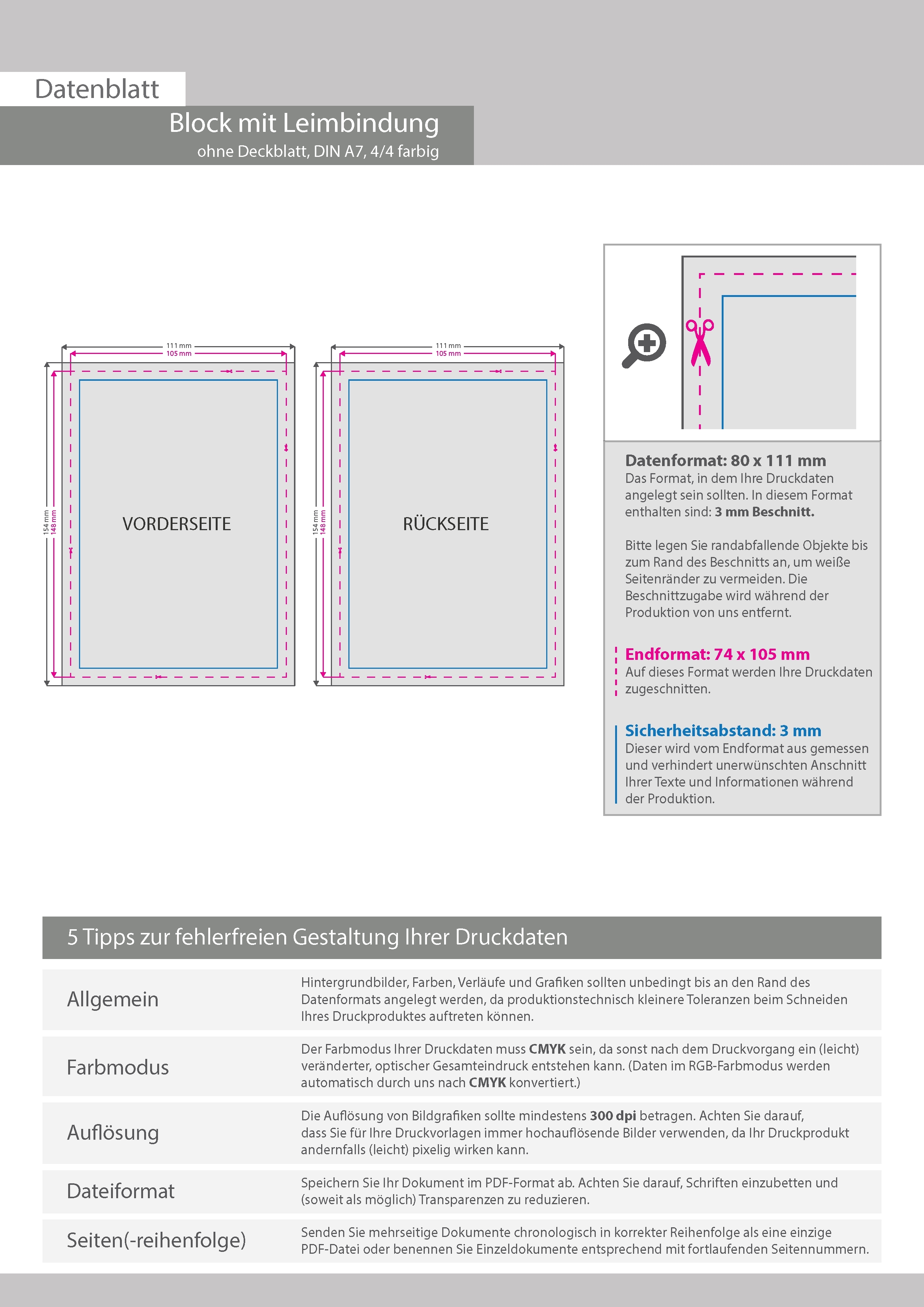 Block mit Leimbindung, DIN A7, 10 Blatt, 4/4 farbig beidseitig bedruckt