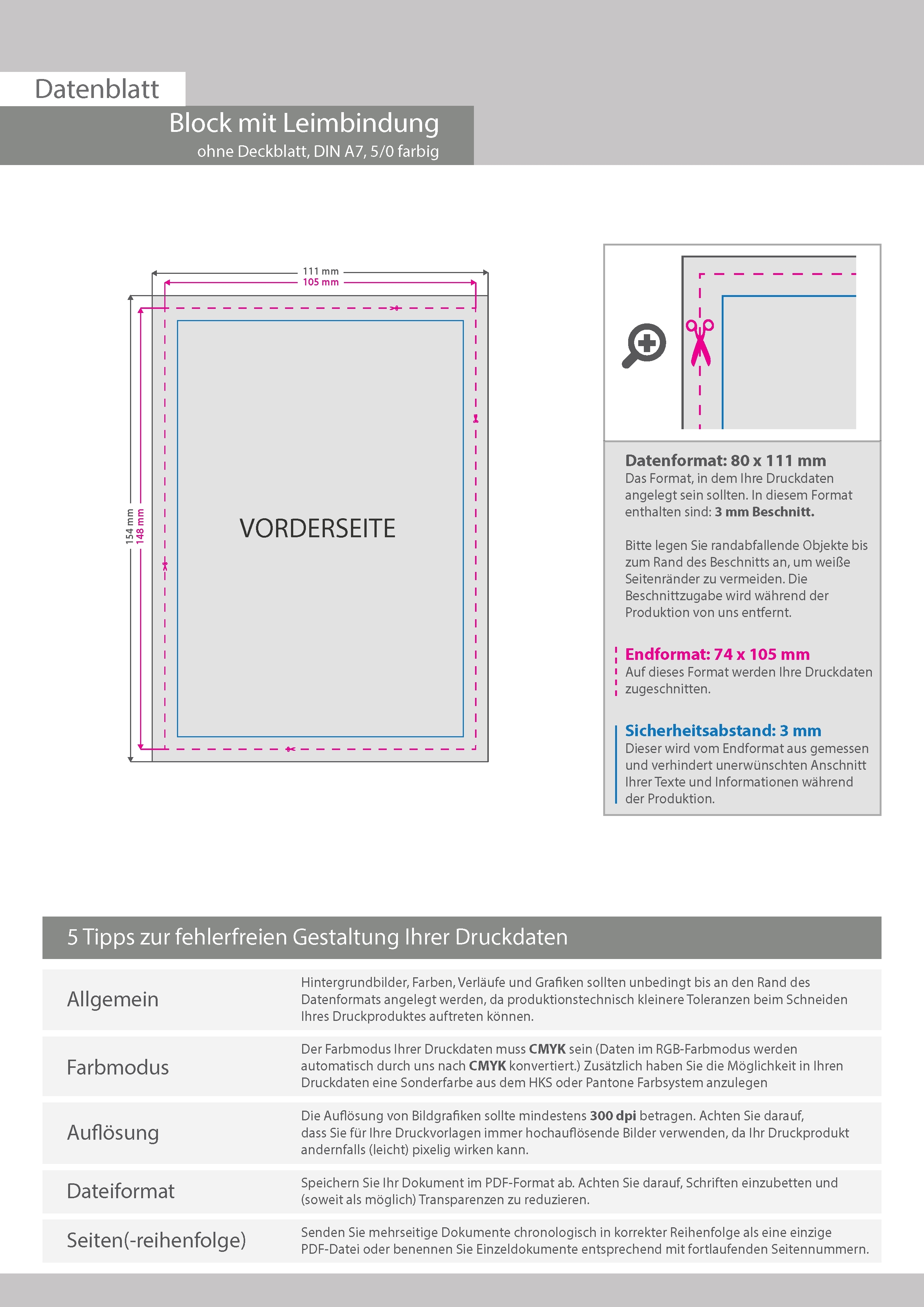 Block mit Leimbindung, DIN A7, 200 Blatt, 5/0 farbig einseitig bedruckt (CMYK 4-farbig + 1 Sonderfarbe HKS oder Pantone)