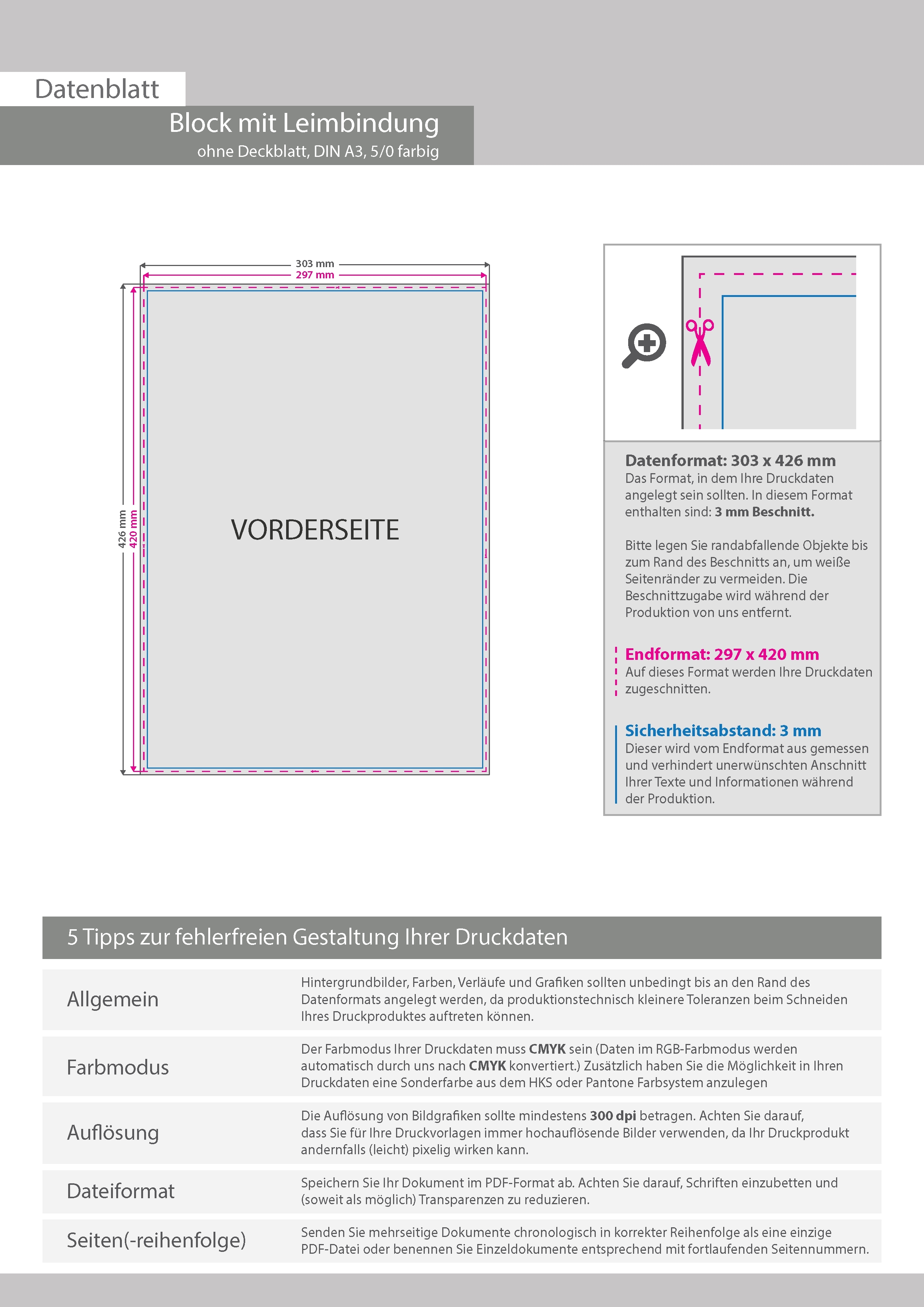 Block mit Leimbindung, DIN A3, 25 Blatt, 5/0 farbig einseitig bedruckt (CMYK 4-farbig + 1 Sonderfarbe HKS oder Pantone)